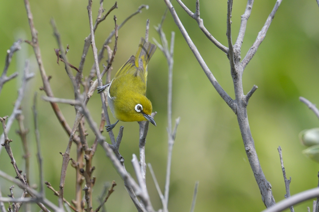 緑色の身体に白くはっきりとした目の縁取りがあって、小さい鳥ですが識別は至極簡単です。さえずりは、一聴して長い節回しが延々続き、少々捉えどころがないような感じです。ただ「チュルルルー!」と聞こえてくる地鳴きを含めて声質が独特なため、一度鳴き声を覚えてしまえば、見つけるのは簡単になると思います。