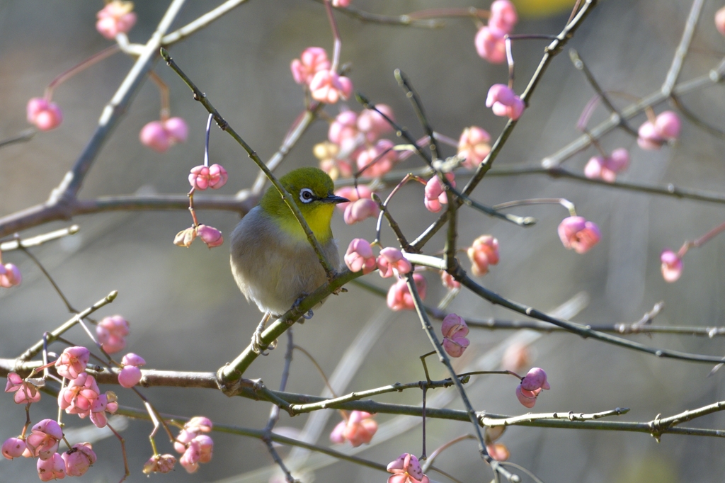 マユミの赤い実を食べにやってきたメジロ。と思ったら、写真を見る限りもう中身の種はほぼ落ちて空っぽですね。でも一足早い「梅にメジロ」な絵が撮れて良かったです。