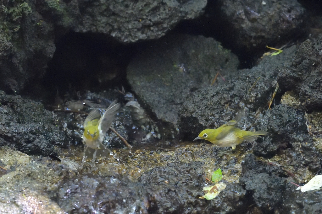 山梨の水場にやってきたメジロ三羽。にぎやかで元気で、あっち行ったりこっち行ったりとにかく忙しない。見ているだけで顔が笑顔になる時間でした。