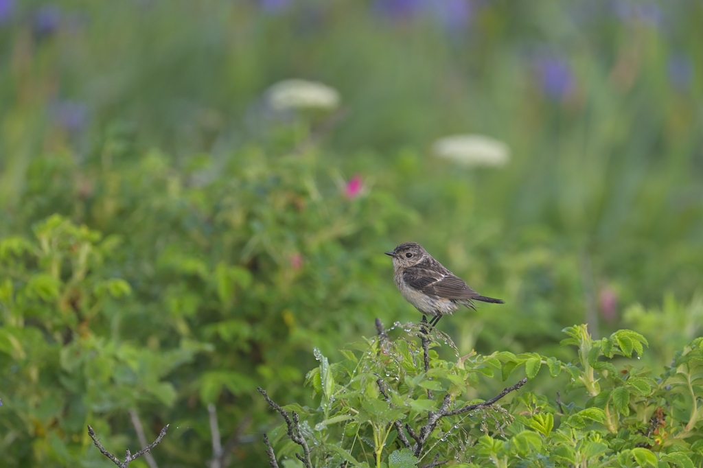 道東に多々ある原生花園。鳥見のものにとってあこがれの観察場所です。後ろに見える紫の花はヒオウギアヤメです。道東の原生花園では他にエゾカンゾウやハマナスなどが咲き誇り、そこに白いハナウドも混じって一面が色とりどりです。普段モノクロームな街中に住む者からすれば、ここは本当に夢のような花園だと感じました。