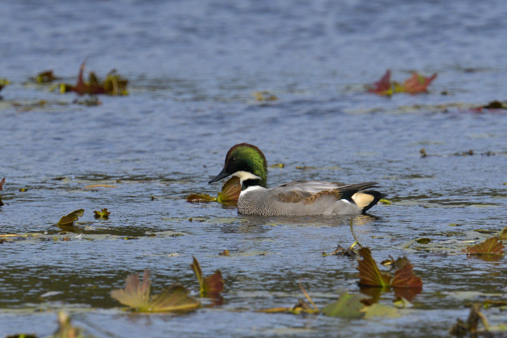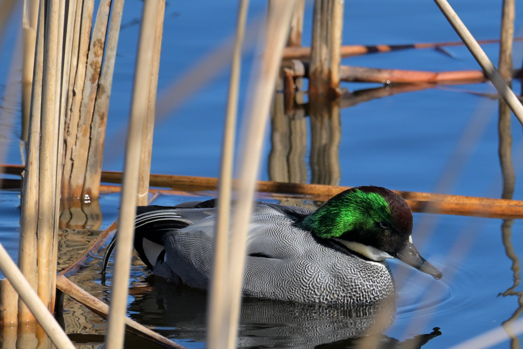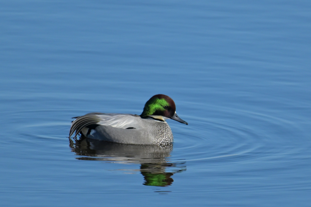 完全に生殖羽になっているので、三列風切りが水面まで垂れています。英語名の"Falcated"は「湾曲した」という意味で、この三次風切りをイメージした命名です。こうしてみても、とても絵になる優雅なカモではないでしょうか。