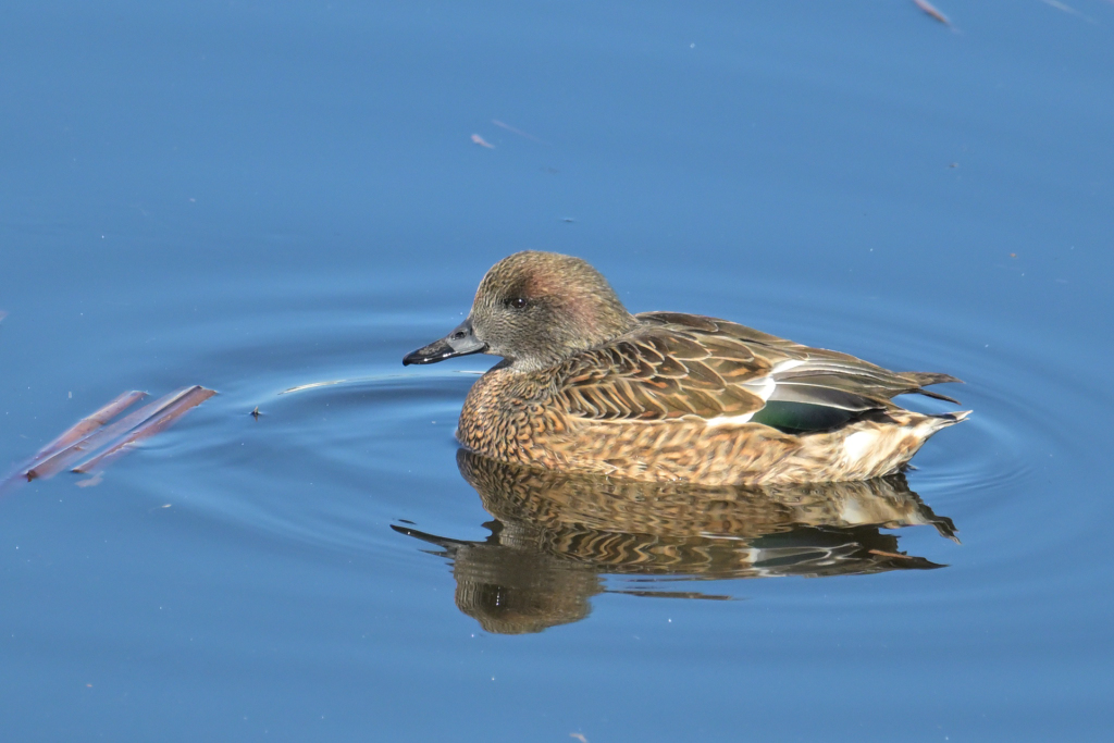 一つ上の ♂ くんと同じ場所で撮った ♀。目じりがほんのり赤みがかっていておしゃれです。全体的に見てヒドリガモの ♀ とよく似た感じがします。違いはクチバシの色で、ヨシガモは全体的に黒っぽく、ヒドリガモは先端以外がはっきりした灰色をしています。