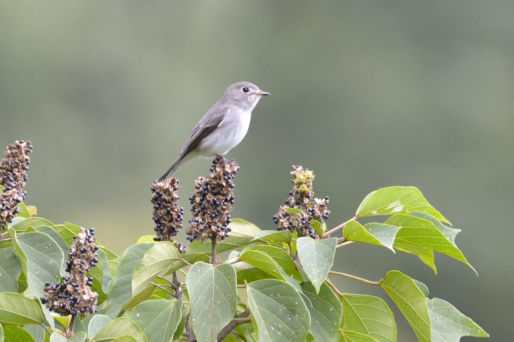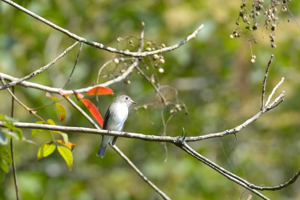 コサメビタキは夏の繁殖の時期は虫エサを主としていますが、見ているとこのときは足元のアカメガシワの実を食べていました。これから南の国へ帰るのに、色々なものをたくさん食べて体力を蓄えているところなのでしょうか。