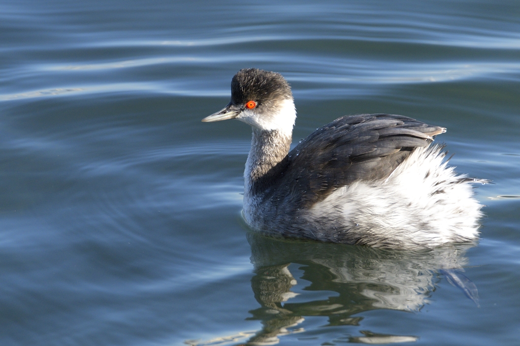 ハジロカイツブリはカイツブリとよく似たシルエットを持つ小型のカイツブリです。しかしカイツブリとは色目が全く違っていて、カイツブリは全身茶色風な姿をしているのに対し、ハジロカイツブリは頭に黒い帽子を被り、顔から首、腹までが真っ白と、非常にコントラストの高い色目をしています。また彩度の高い真っ赤な目をしているのも非常に目立ち、黄色い目のカイツブリとの見分けを簡単にしています。