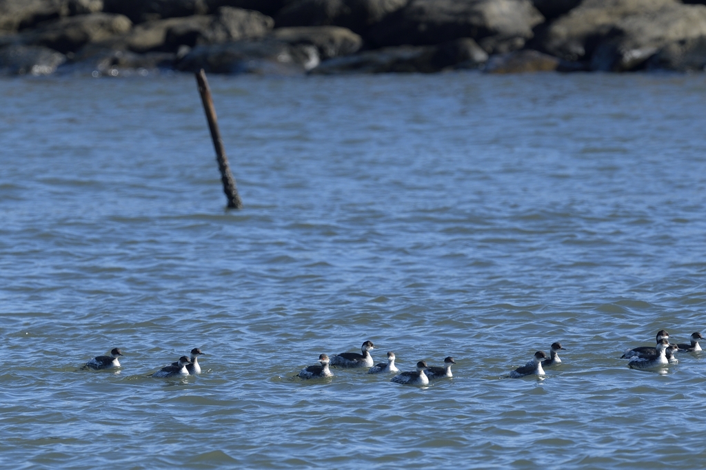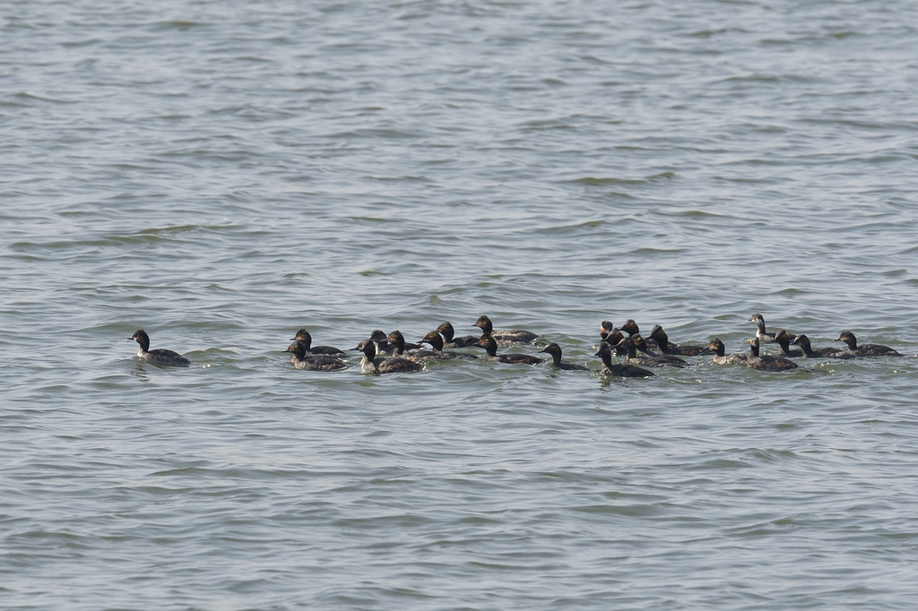 冬の東京湾で撮ったハジロカイツブリの群れ。ハジロカイツブリはポツンと単独かせいぜいカップルくらいで見ることが多いので、たまに群れで現れると「何者 ?」とハジロカイツブリであると認識するのにかえって時間がかかってしまいます。ただ、小さい水鳥の群れが潜ったり浮かんだりしながら、ワチャワチャと進んでいく姿をみるととても可愛く感じます。