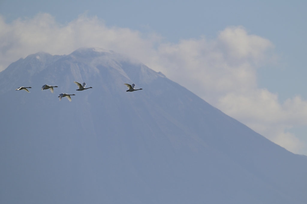 コハクチョウが頭上近くに飛んでくると、「ブイブイ」というような連続的な羽音が聞こえてきます。割と低めな振動音のような感じの音です。「たまたまかな?」と思いましたが、その後何羽も同じような音が聞こえてきたので、おそらくコハクチョウの飛翔ではよく聞こえる音なのだろうと思われます。初めて聞くタイプの羽音でしたので、印象に残っています。