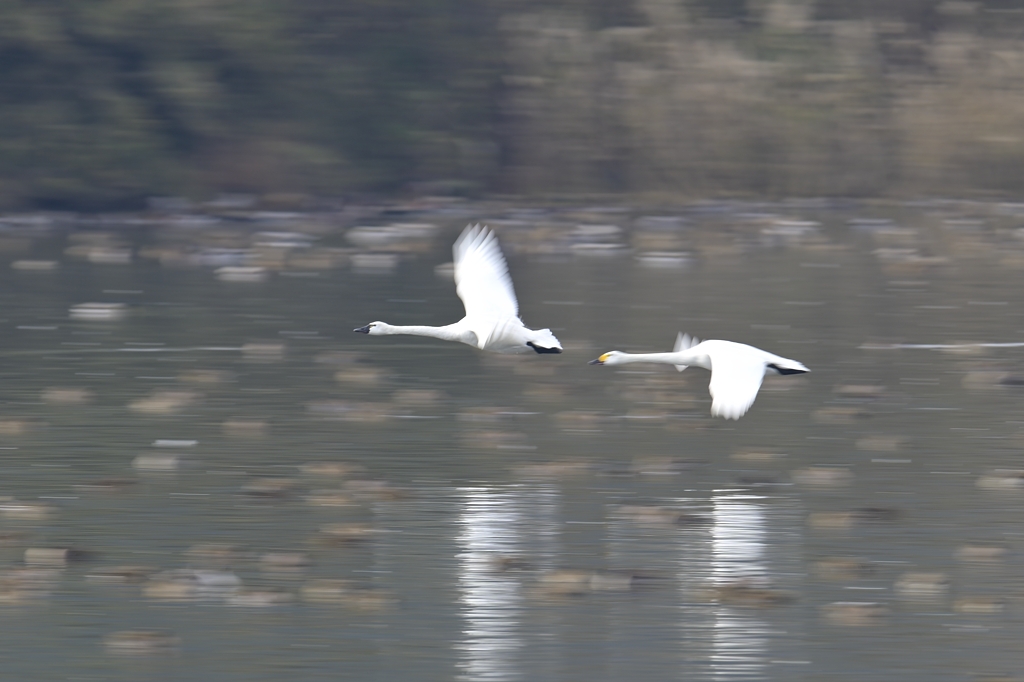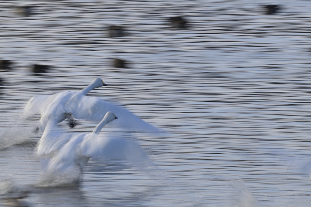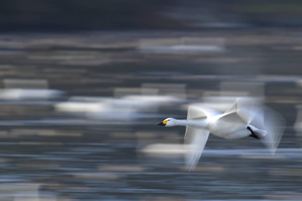 「亜種コハクチョウの飛翔 低SSの流し撮り 1,2,3」 クリックで拡大します。