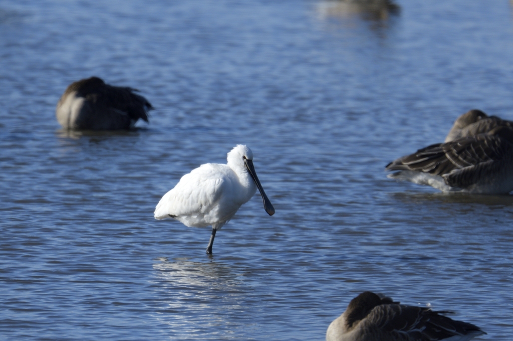 クロツラヘラサギとの違いは、まず目がどこにあるかわかるかどうかでしょうか。クロツラヘラサギはくちばしから額や目元まで黒色で目がどこにあるのかわかりにくいですが、ヘラサギは目が独立して現れているので、これが最大の見分け点となります。またヘラサギはクチバシ先端部が黄色くなるので、そこでもわかるかと思います。