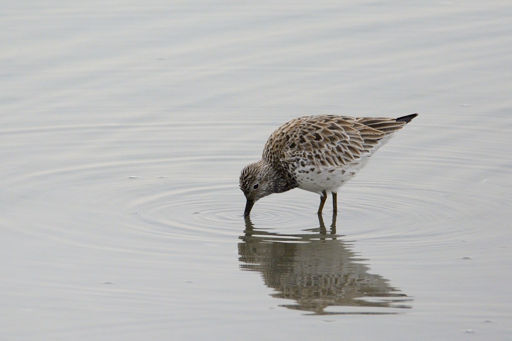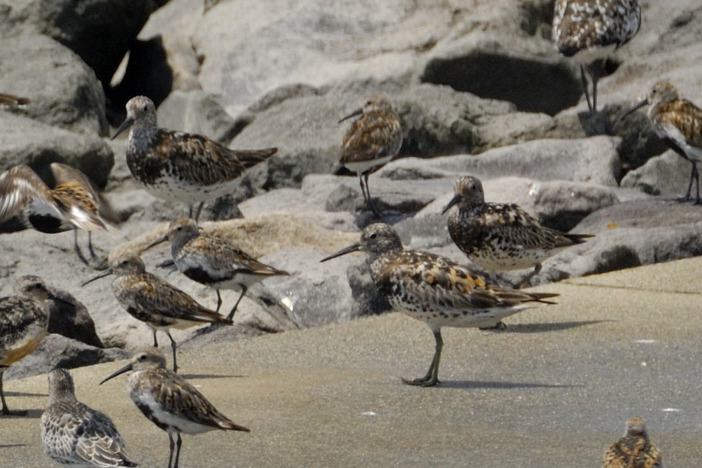 オバシギは日本では旅鳥です。9回ある私の観察記録で春は4月に一度、残りは皆秋の渡りで8月~10月の間に集中しています。いつも一度に見る数は片手で数えられるくらいまでで、どちらかというと数は少ない鳥だと思います。