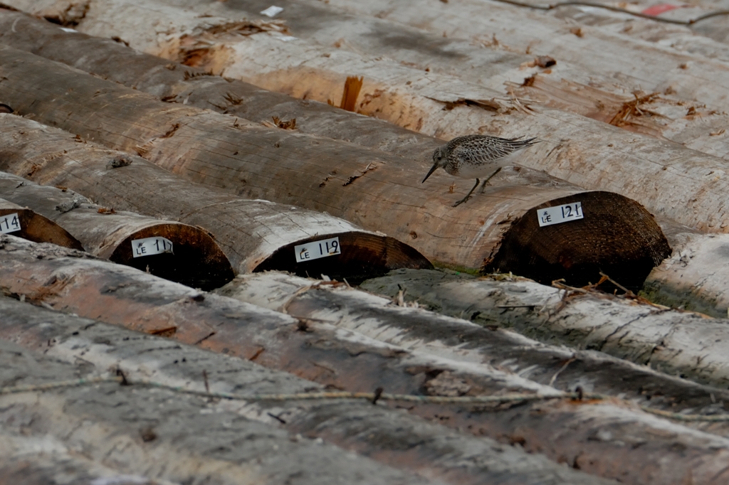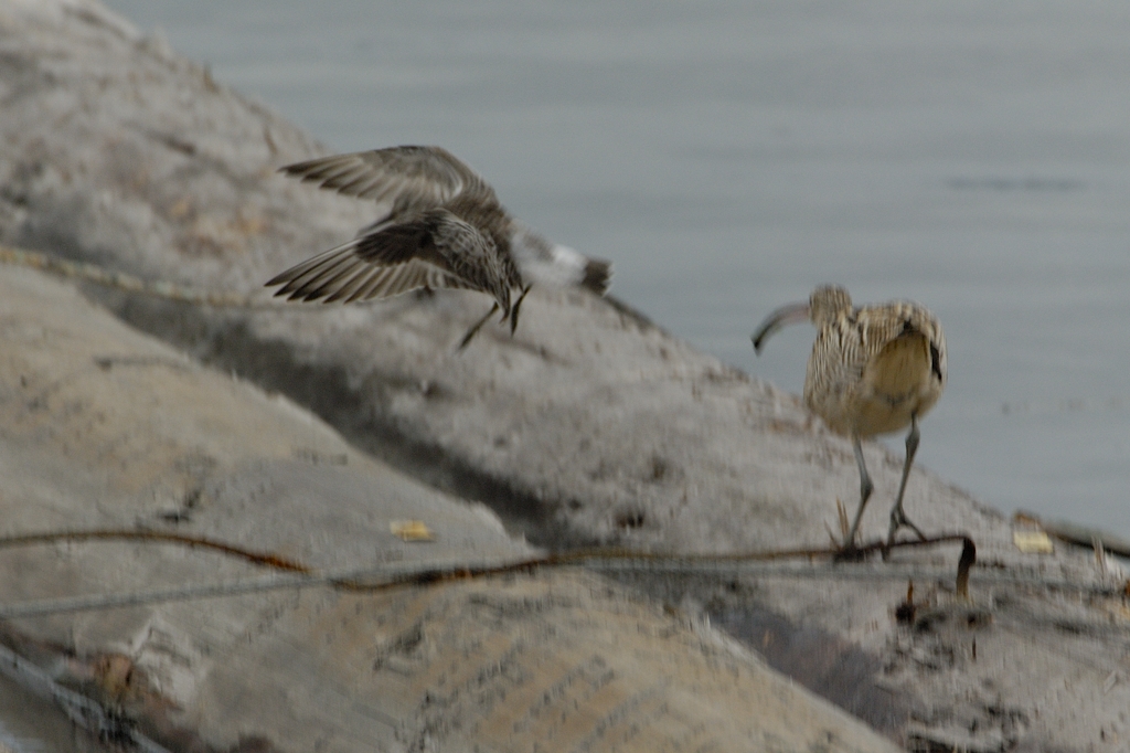 瀬戸内海に浮かんだ丸太の上で、なぜかホウロクシギと並んでいたオバシギ。2枚目の方は色々ブレていますが、オバシギは腰が白いのがわかりますでしょうか。
