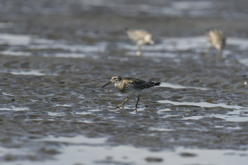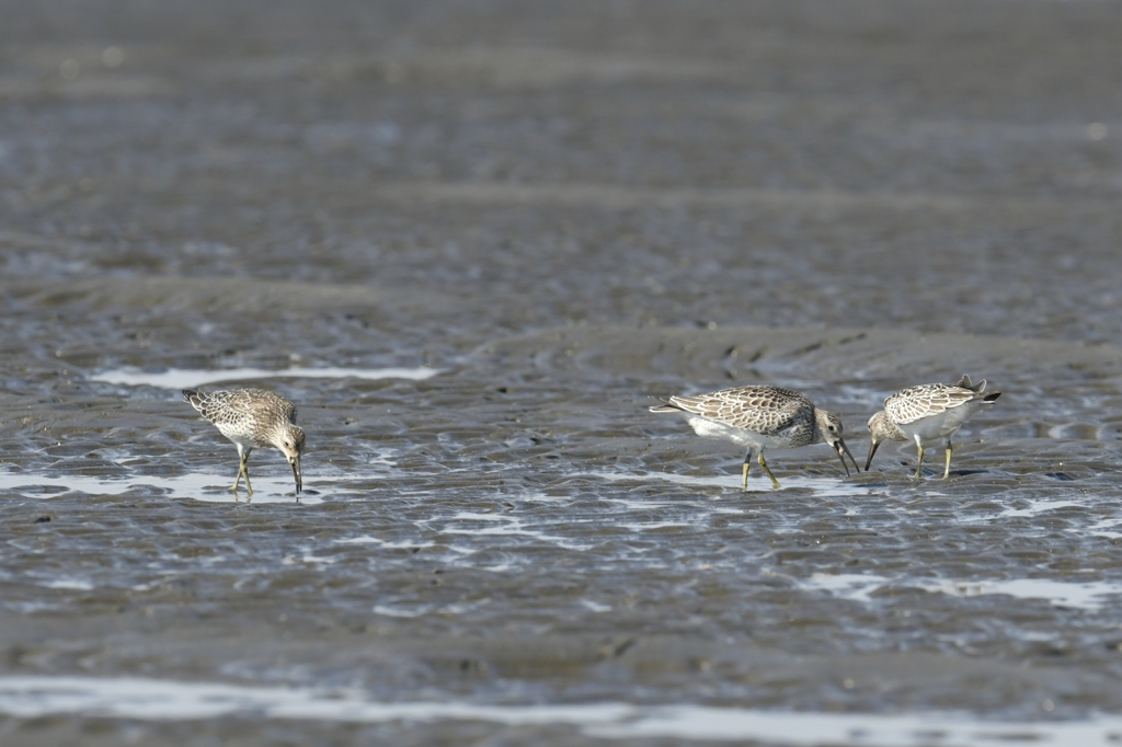 東京湾の干潟で見つけたオバシギたち。羽色が濃いのでおそらく皆今年生まれの幼鳥だと思われます。