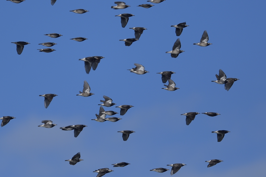 ムクドリはバタバタと細かな羽ばたきで直線的に飛ぶ場合が多いです。体が丸っこいこともあって、印象としては飛ぶのはあまり得意でなさそうに感じます。また、群れがどこかに止まろうとするとき、羽をデルタ機みたいな三角形にして、着地点の周りを滑空しつつ降りていくことが多いです。どの鳥もそうですが、一見地味なムクドリも、飛ぶこと一つ取っても「この鳥らしい」特徴があって面白いです。