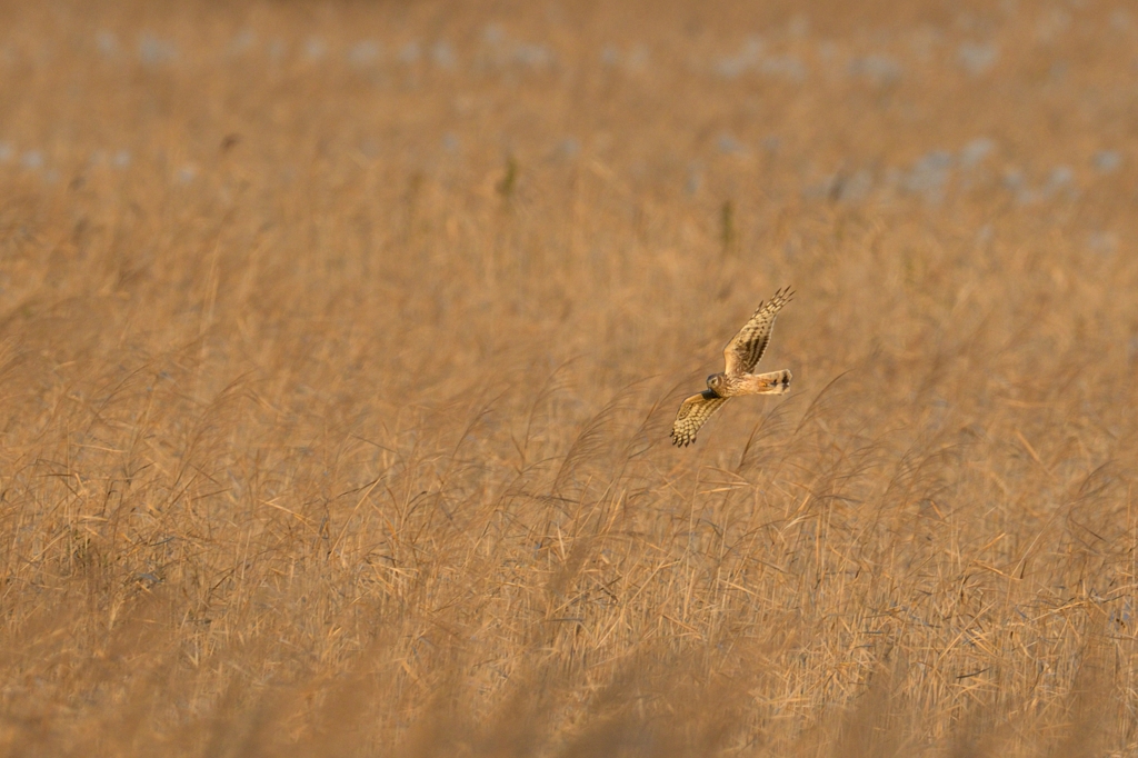 ハイイロチュウヒはチュウヒよりやや小ぶりな冬の猛禽類です。北方から越冬のために日本にやってきて、広い葦原をねぐらにして周囲のネズミや小鳥などの小動物を狩ります。