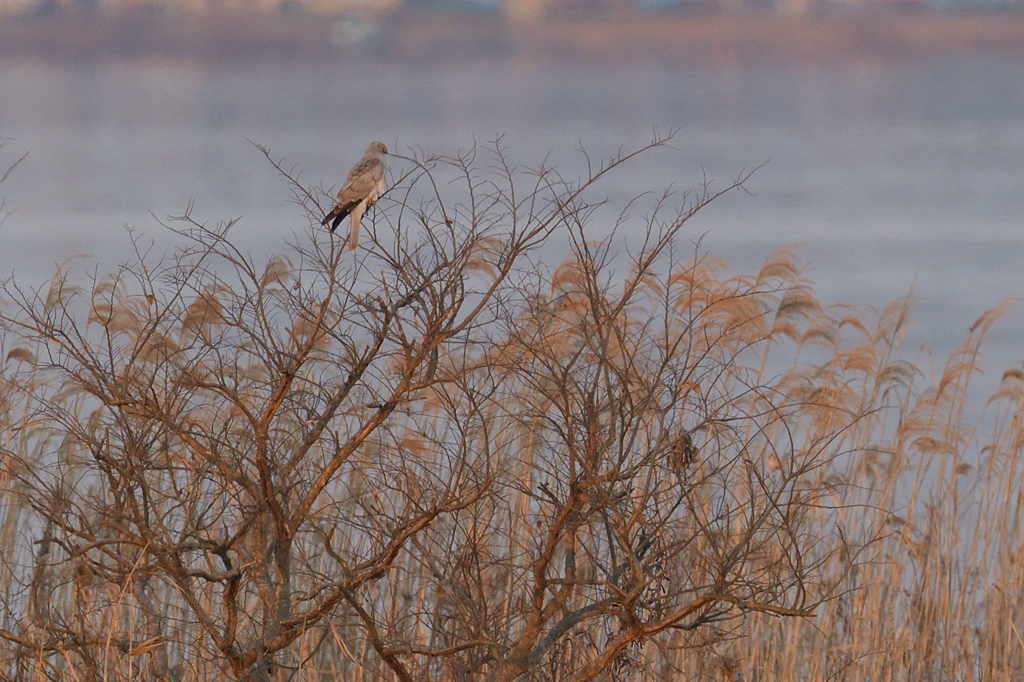 陽が沈んだ後、ハイイロチュウヒの ♂ がねぐらの葦原に戻ってきました。暗い中なので荒い絵ですが、チュウヒ類の観察・撮影はいつもこんな感じです。