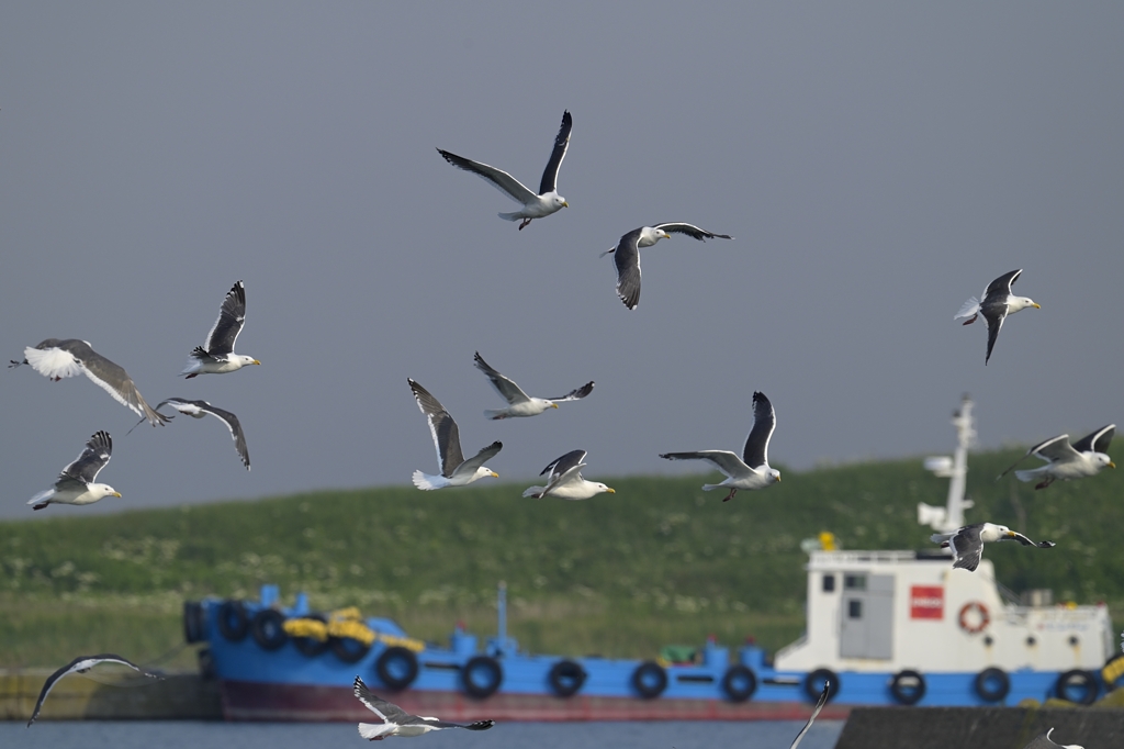 こちらも夏の北海道で撮った夏羽のオオセグロカモメの群れです。宿泊先の朝食前にカメラを持って朝練に出かけ、途中に寄ってみた漁港で撮った風景です。丁度朝の漁から戻ってきた漁船に、おこぼれを狙おうとたくさんのオオセグロカモメたちが寄っていました。