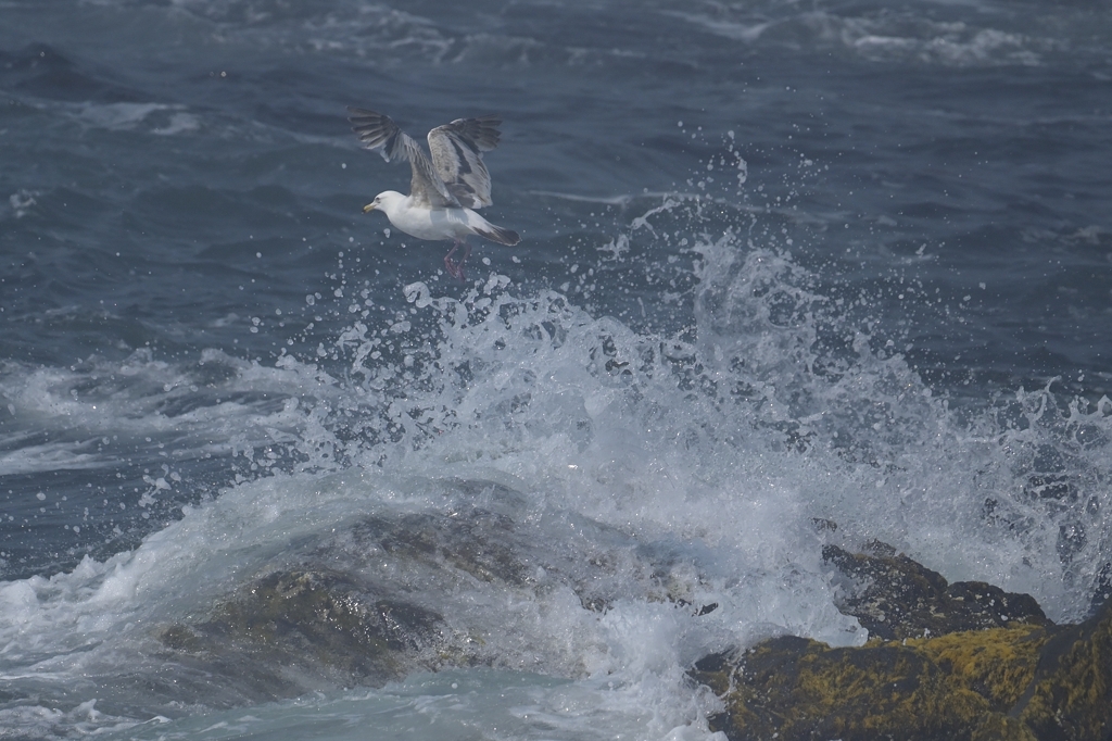 道東へ鳥見旅行に出かけた際、岬の周りでオオセグロカモメがたくさん飛んでいました。少し先の岩場では巣もあって繁殖しているようです。