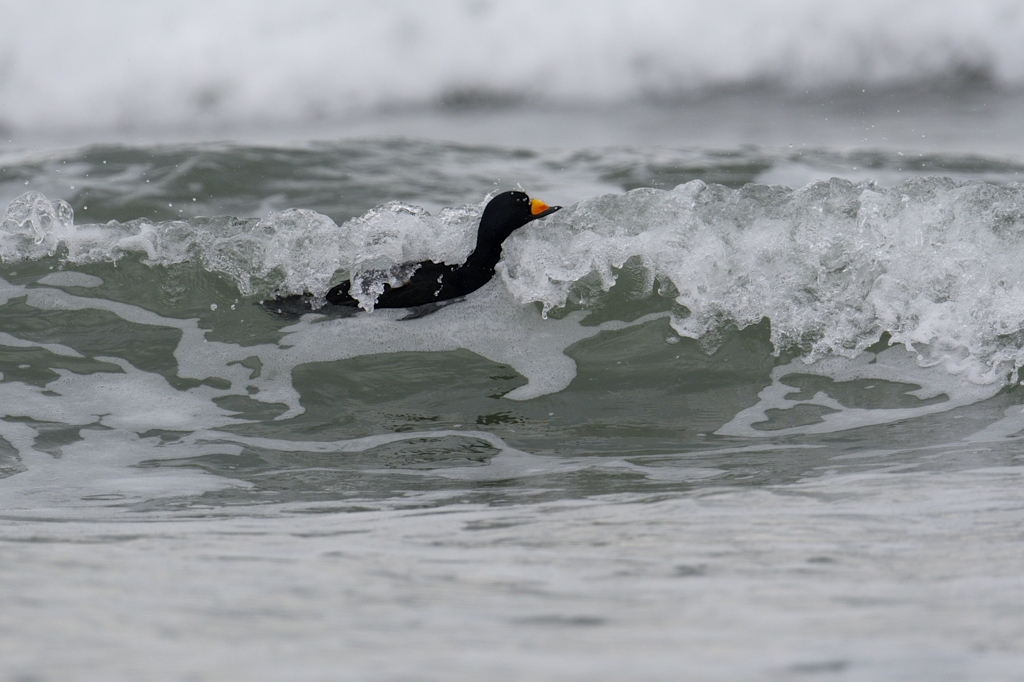 割と浅場に来てくれたクロガモの ♂ 。波に揉まれる姿を見ると、どこかイルカの仲間のような錯覚を感じます。