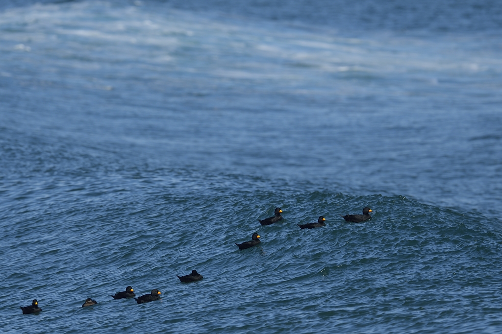 九十九里浜だと、天気が荒れてから収まって2日目くらい、空がきれいに晴れたようなタイミングで、足場の良い突堤などに行けば、「青い海と適度に荒れた波」という最高のシチュエーションで海ガモ類が観察できるのでお勧めします。(そのようなチャンス、タイミングは一冬で何度もありませんが、見に行くだけの価値はあると思います。私は過去2度ほど経験していますが最高に楽しかったです)