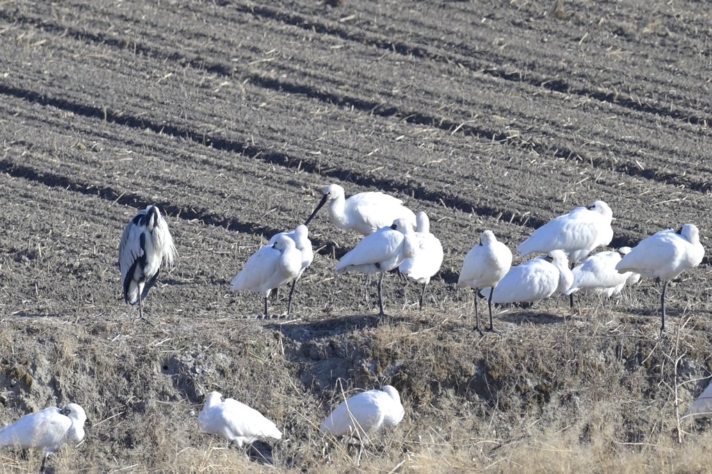 有明海の干潟が満潮になると、クロツラヘラサギたちは近くの田んぼに上がってきて休憩していました。その数ざっと25羽程度でしたか。ここ以外に飛んでいったのも含めると、当地にはおよそ30羽くらいがやってきているようでした。ただよく見るとこのうち5羽以上はクロツラでない「ただのヘラサギ」です(日本ではこっちの方が飛来数が少ない)。この絵の中に限っても少なくとも4羽はヘラサギです。さてどれがヘラサギかわかりますでしょうか?