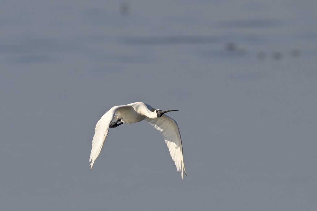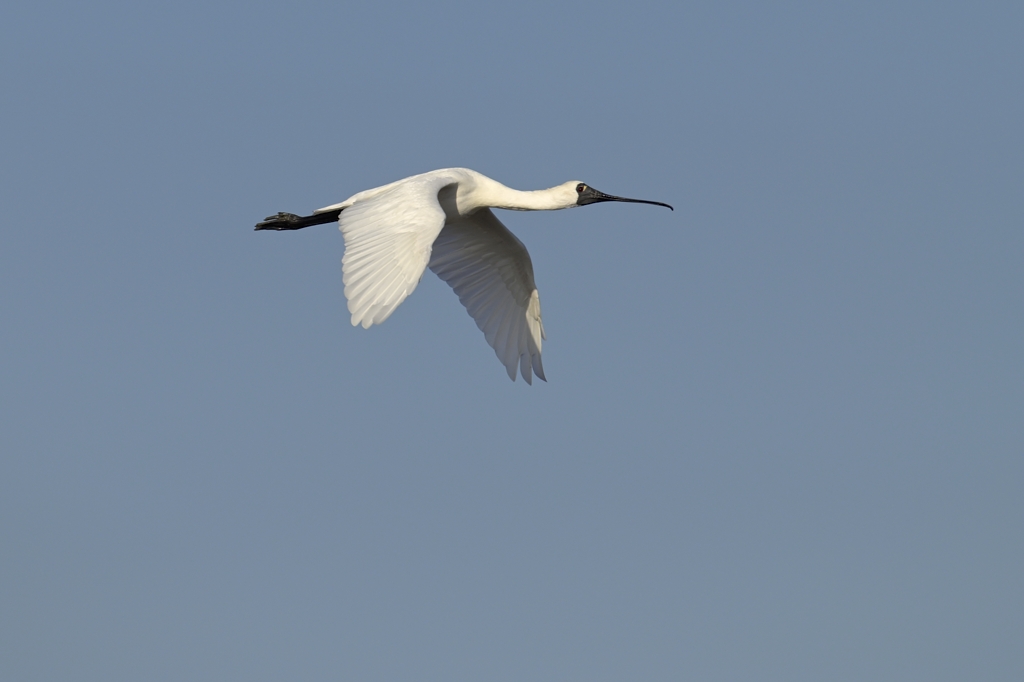 クロツラヘラサギは名前に"・・サギ"と付いているものの、実際はサギの仲間ではなくトキ科に属する鳥です。サギ科の鳥とは同じペリカン目同士なので、DNA的にそう遠くないものの、やはり色々と違いがあります。両者を比べたときに一番わかりやすい違いと言えば、トキ科の鳥はサギ科のように首をS字に折りたたまず、真っ直ぐ伸ばしたままで空を飛ぶ点でしょうか。