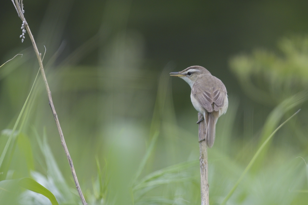 コヨシキリの見た目は北海道に多いセンニュウ類とよく似ています。鳴き声で見つけられれば、これで間違いなく同定できますが、見た目の方も頭側線といって白い眉線の上の筋線が濃い褐色をしているので、よく見れば顔つきでも判別できると思います。姿も少しずんぐりしていて、愛嬌もあって可愛い感じの鳥です。