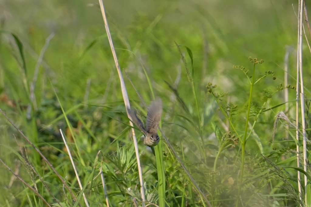コヨシキリがこちらに向かって飛びました。正面から見ると、頭頂線が濃いのがよくわかります。翼全体も茶色い感じでちょっとセッカ風ですね。