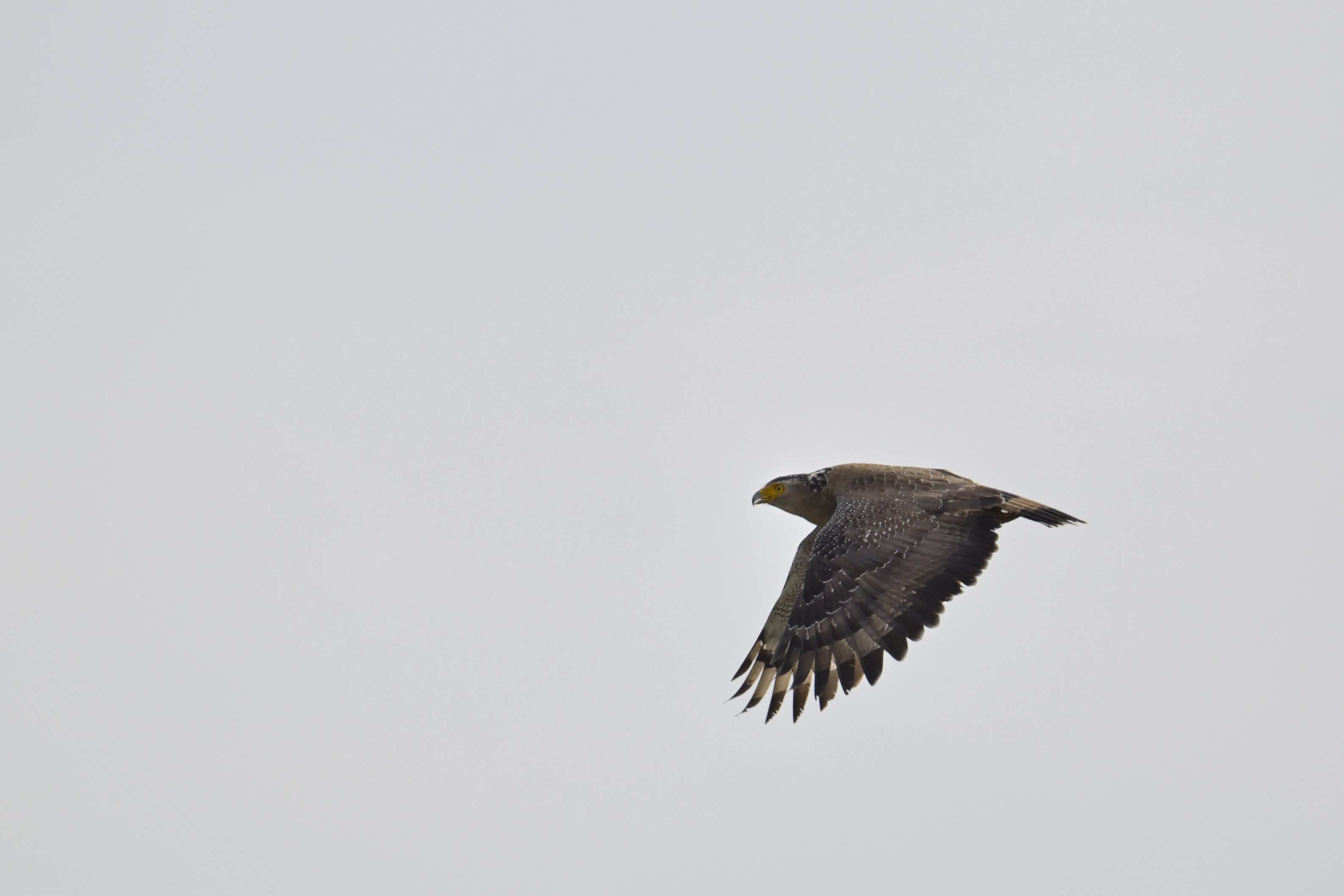 カンムリワシは、国内では八重山諸島の一部の島でのみ見られる中型のワシです。サイズ的にはトビより小さく、オオタカやノスリレベルのサイズですから、タカ科としては中型ですが、ワシの名がつくものでは小型と言っていいかもしれません。