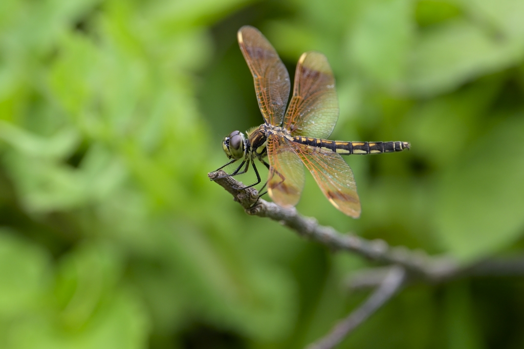 こちらは長野の高原湿原で見つけたヨツボシトンボの ♀ です。特に翅の真ん中の星が上の ♂ 個体より太くて目立つのがわかりますでしょうか。この個体を見つけたときは、「ここまではっきりと模様が出ていれば、ベッコウトンボと比べても負けないくらいきれいな姿だよな」と感じました。(もともとヨツボシトンボはベッコウトンボとかなり近い種です)