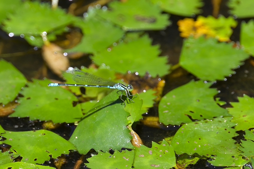 そんなとき唯一目印になるのが腹先端にある水色のワンポイントです。ファインダー像がぼけていても、なんとなく水色の点が見えればそこを頼りにフォーカスを合わせる感じでしょうか。マクロに近い近距離撮影では、わずかにフォーカスがずれるだけで、被写体が大きくぼけてしまうので、アジアイトトンボの撮影は撮る前のファインダー操作がまずもって難しいと感じました。