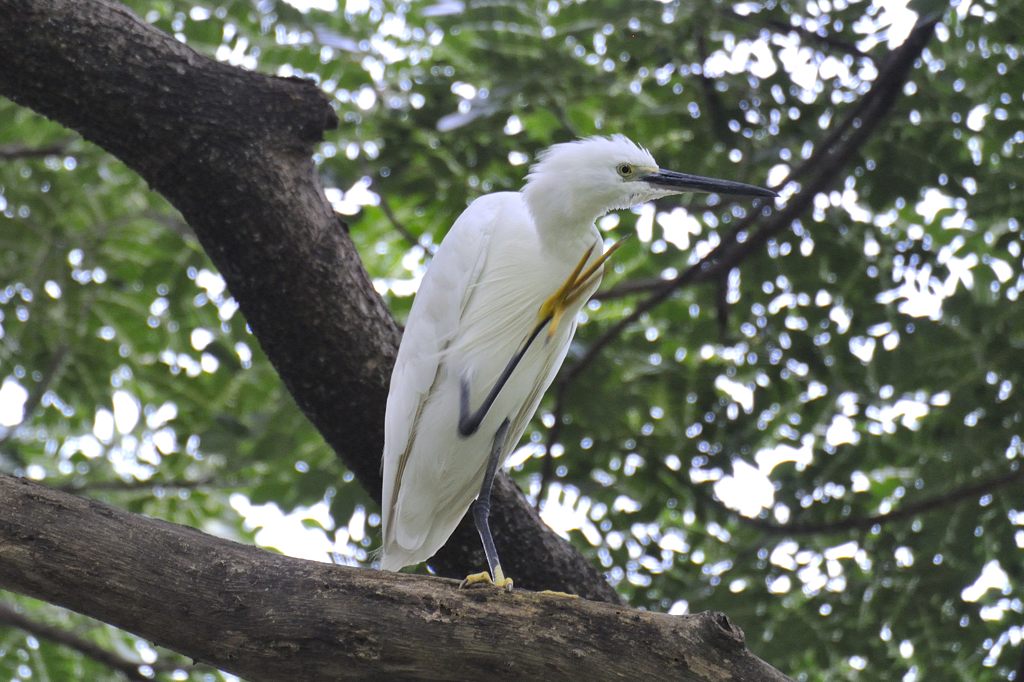 このコサギは見たところ日本のコサギと同じに見えます。念のため図鑑で調べてみたところ、同じ亜種であって日本のものと全く変わりないことがわかりました。ただ日本ではこの写真のように木の高いところに止まって休むような姿を見ることがない(少なくとも私の記録には一つもない)ので、「やはり南国の鳥は水辺に用がないときは暑さしのぎに木陰で休むのかな?」と感じました。