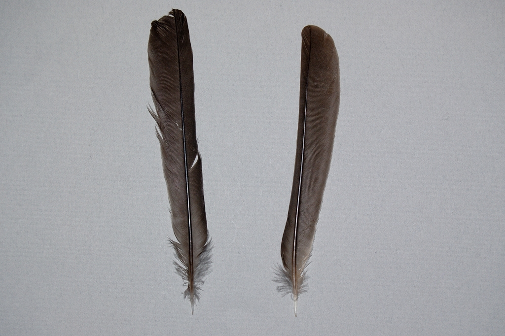 どちらの羽根もヒヨドリの尾羽です。左側は横浜市内の自宅の庭で拾った内側2番か3番、右側は神奈川県清川村で拾った一番外側6番の尾羽だと思われます。