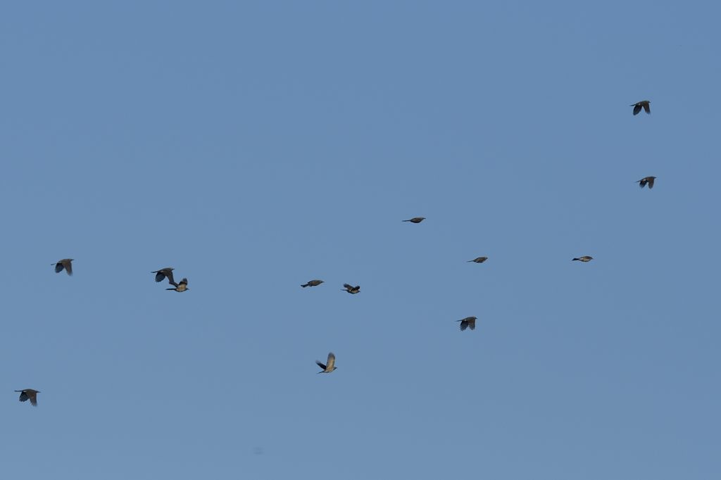 三浦市の海岸で海鳥を観察していたときに、上空を通り過ぎて行ったヒヨドリの団体さんです。ヒヨドリも海上を移動する渡りをするらしいですが、今回のものは時期的に見て渡りではないと思います。