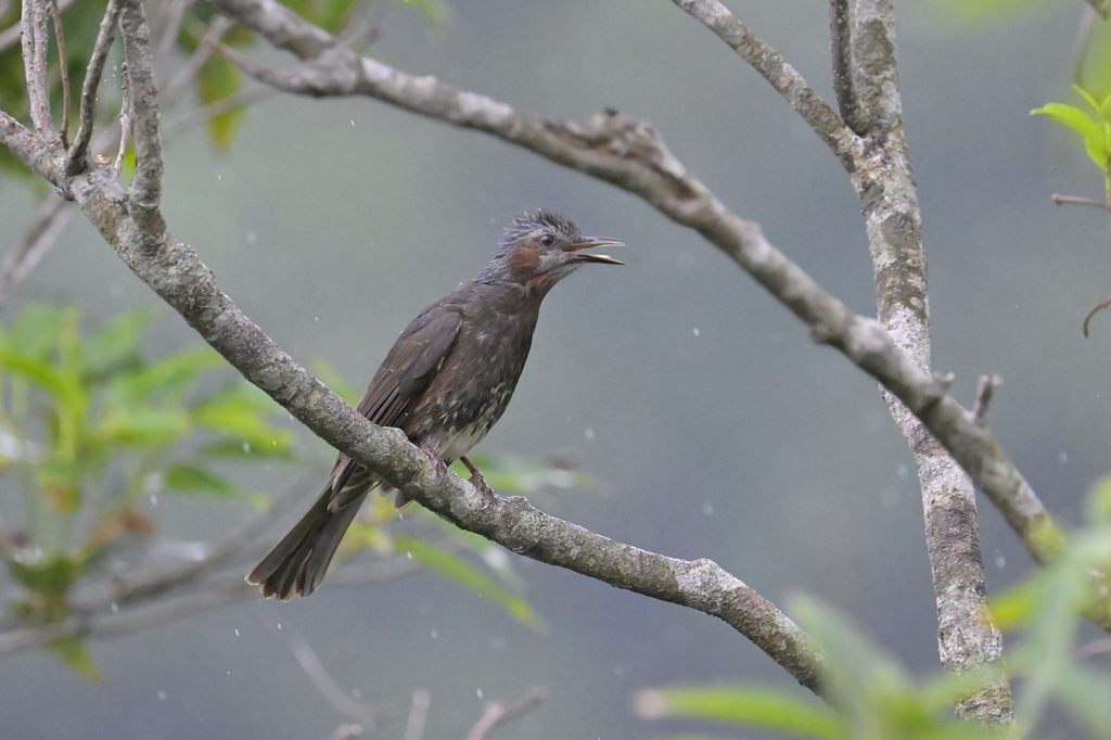 ヒヨドリは国内に8亜種が認められています。そのなかでこちら亜種イシガキヒヨドリは本州の亜種ヒヨドリと比べて全体に暗い色をしていています。特に胸あたりが一面濃いグレーで埋まっているのが見えますでしょうか。本州のもののように胸から腹にかけてののうろこ模様が見えないので、現地で初めて見たときもいつもとはだいぶと違った印象を受けました。なお、鳴き声はいつもと一緒でした。