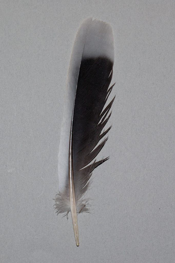 市内の公園で拾ったキジバトの羽根。図鑑で見る限り一番外側6番尾羽のようです。