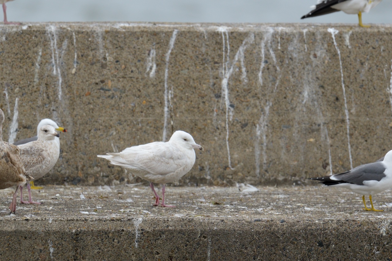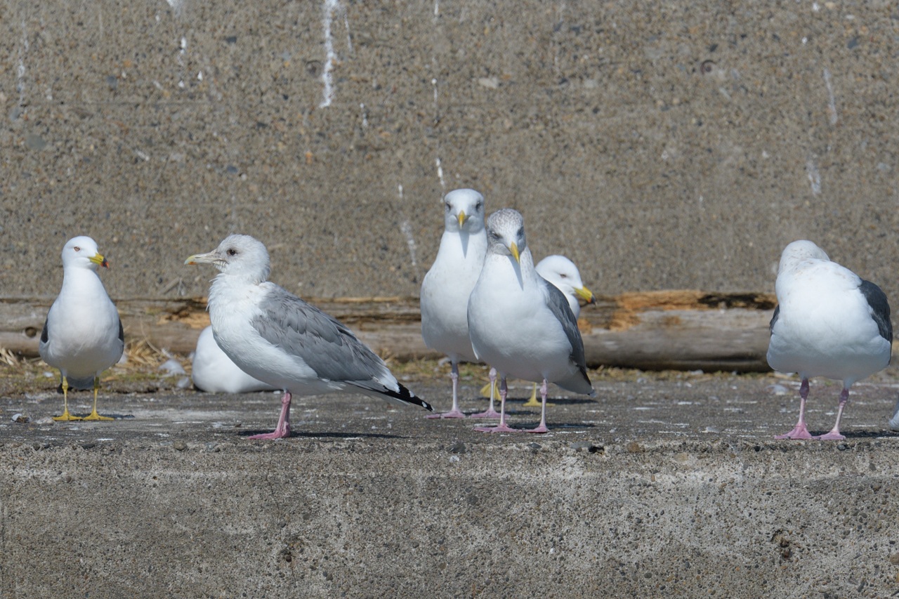上で紹介する絵をみていただけますでしょうか。1枚目はこのときの全景です。銚子は本当にいろんな種のカモメが一堂に見られて面白い場所です。右からユリカモメ、ウミネコ、しゃがんでいるのはユリカモメ、セグロカモメ、セグロカモメの裏に隠れているのは無視)で、次の足が黄色っぽいのがタイミル亜種です。その左の中央に見えるのが典型的な亜種セグロカモメ。タイミル亜種と比べると、頭のサイズや胴体の太さなどで、亜種セグロカモメの方がより立派に見えます。