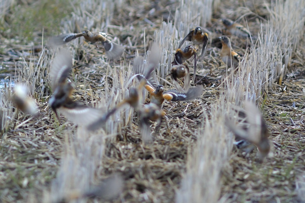 群れで飛ぶアトリです。数百はいたでしょうか。トキの観察をしているとき、目の前の畑を行ったり来たりしていました。