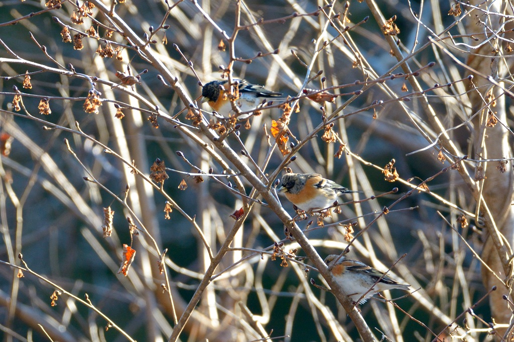 花の芽をついばむアトリたち。ちなみにこの木の芽はウソやベニマシコも大好きだったようで、同じ場所で春まで楽しませてもらいました。