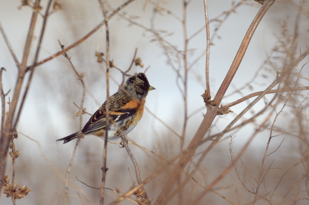 アトリは冬に見られる赤い鳥です。ただ赤というよりはレンガ色に近いオレンジ系なので、同じ仲間のベニマシコなどに比べると鳥見の者からの人気はいまいちな気がします。(ベニマシコは紅というよりピンクで鮮やかですし)しかしアトリは華美な派手さはなくてもとてもきれいな鳥で、昔からよく花鳥画の題材にされています。日本的な落ち着きのある美しさを持つ小鳥といった感じでしょうか。
