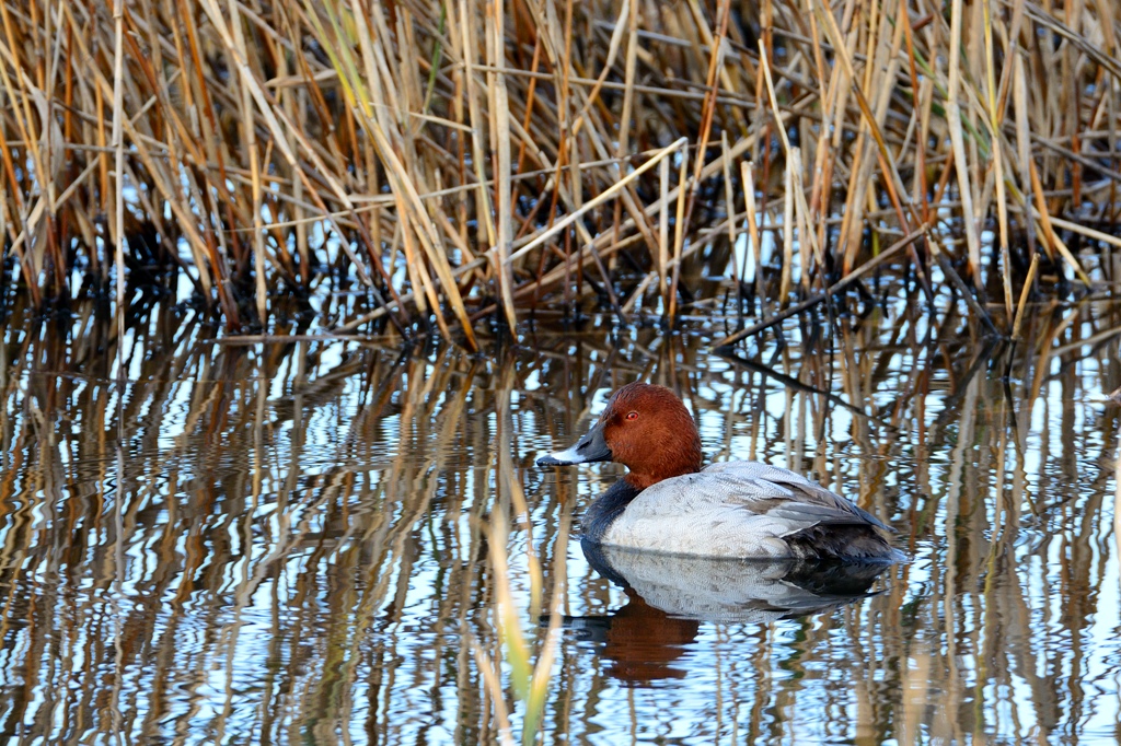 ホシハジロは日本の淡水や内湾でよく見かける潜水タイプの中型のカモです。♂ の色は頭が赤茶色で眼が真っ赤。習性が近いキンクロハジロとは色目が全く違うので、見分けは簡単です。