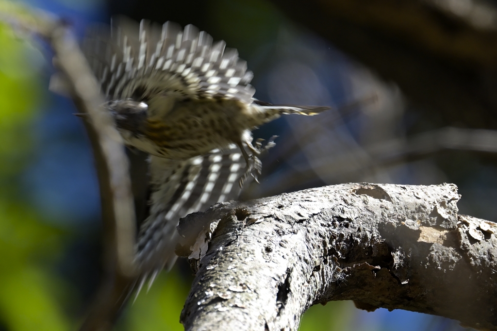 Z6IIとヨンヨンゴを手に入れて、まだ使い方や設定もよくわからないままに、とりあえず近所の公園に試写しに行きました。機材が軽いことに感動しながら手持ちでぶらぶら歩いていたら、頭上に影が。「コゲラ見っけ !」と早速レンズを向けたのですが、残念ながらすぐに飛ばれてしまい、残せたのはこのブレブレの飛び出し写真のみ。「羽根の白黒模様が面白いからまぁいいか」と捨てずにおいていたものを今回サルベージして貼らせてもらいました。