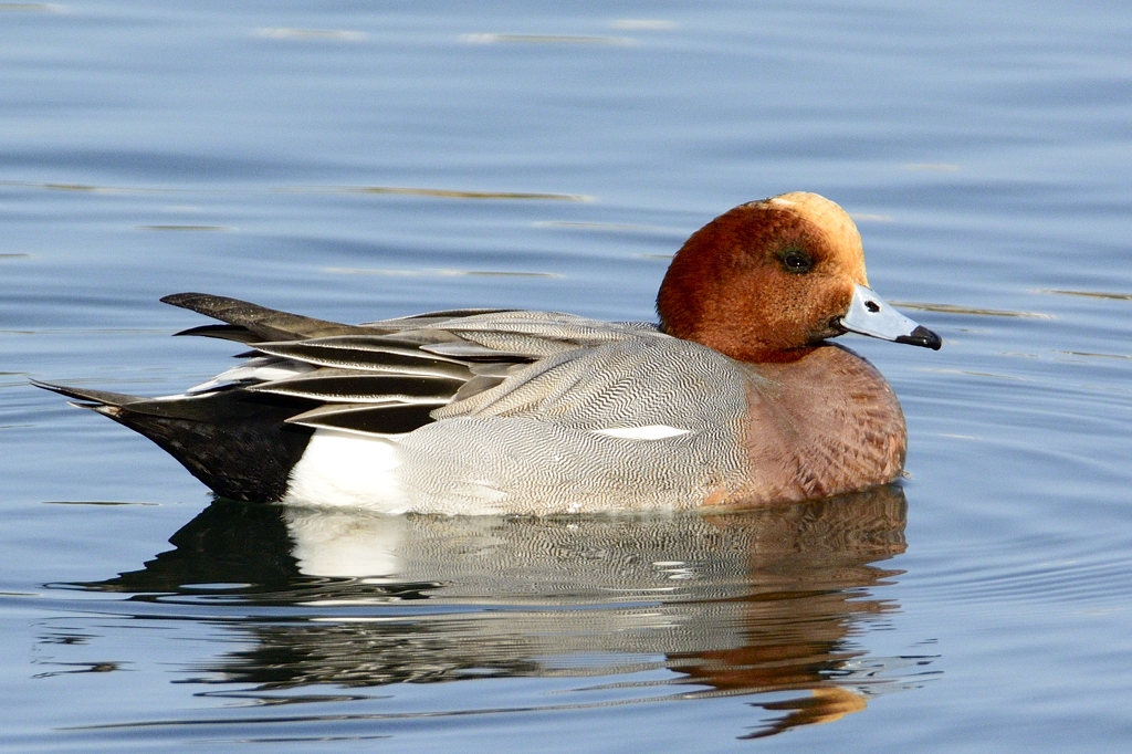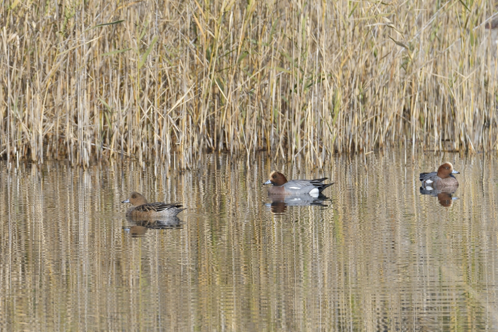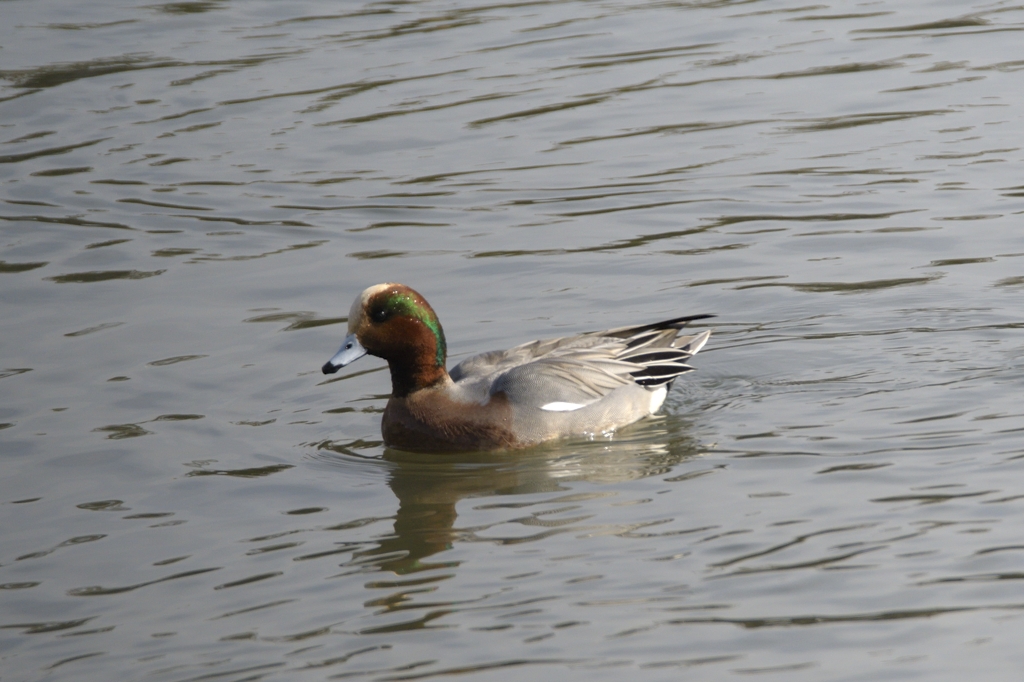 こちらは汽水の川にて撮ったヒドリガモ。まだ年末なのでペアにはなっていないのかもしれませんが、皆平和そうに浮かんで休んでいました。