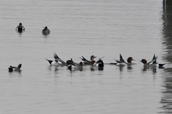 ヒドリガモのオスたちが競ってディスプレイをしていました。求愛ディスプレイをしていても周りにはあまり ♀ の姿が見えなかったりします。それでも戦う相手は ♂ 同士なので、翼を帆のように立てて、自分たちで競い合っていました。