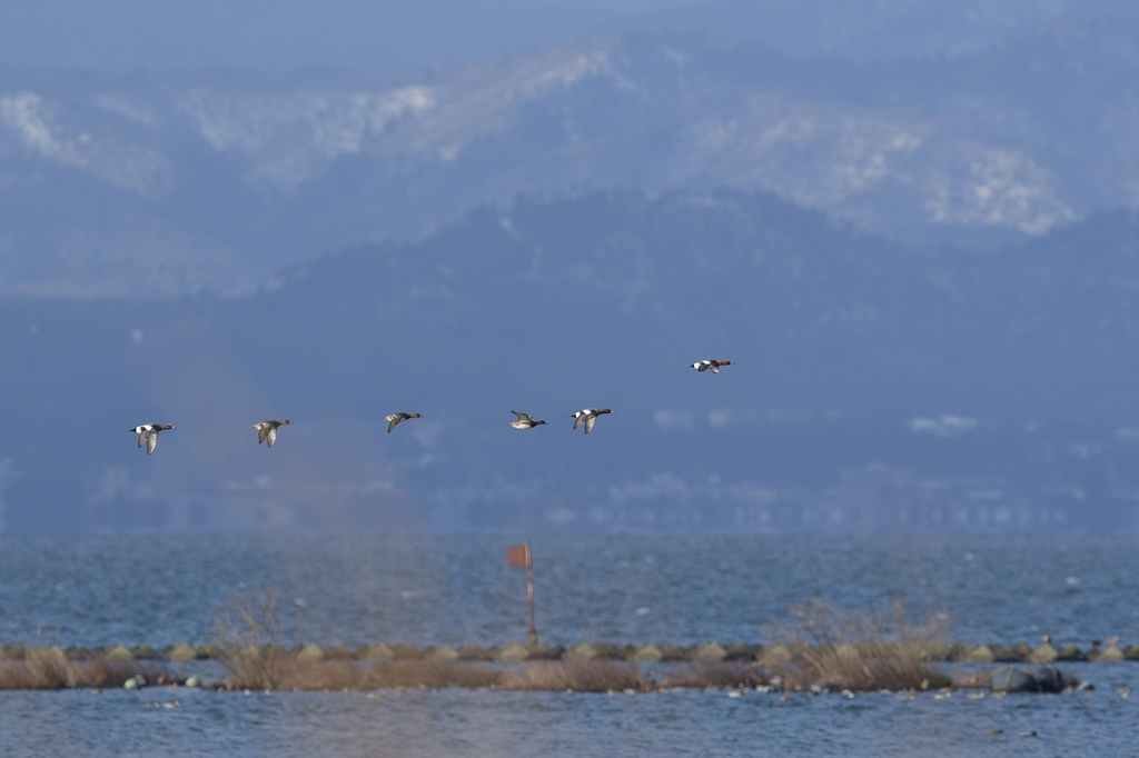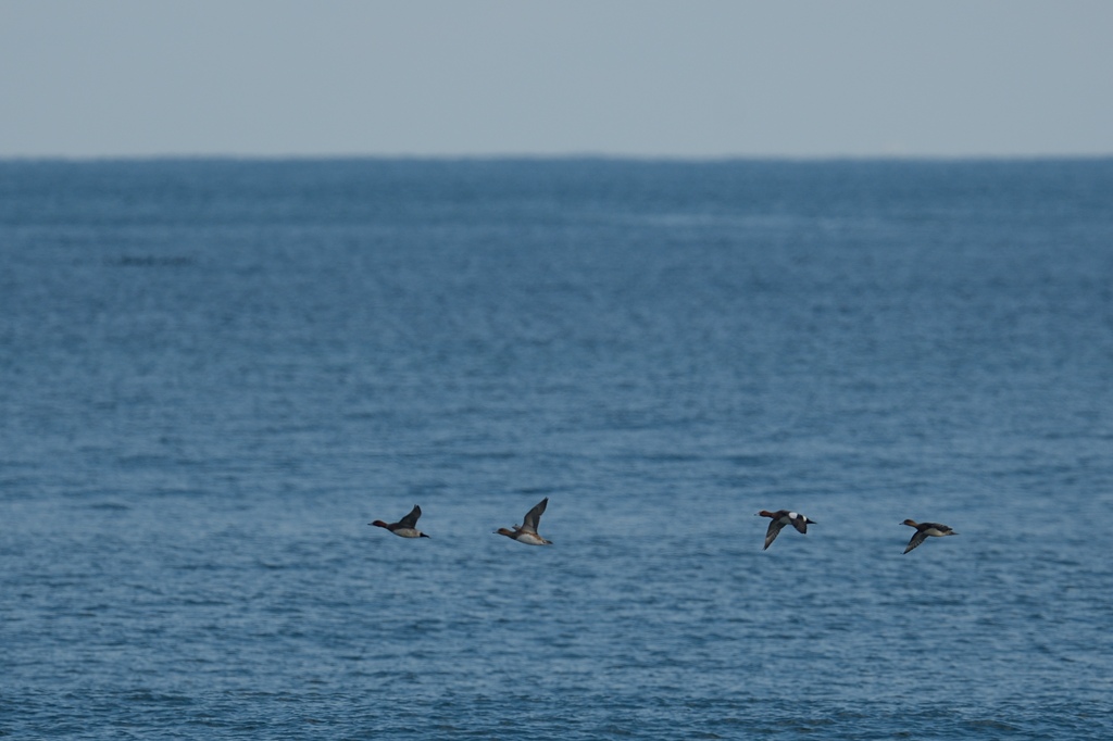 一枚目は琵琶湖にて。二枚目は九十九里浜にて。カモらしく一直線に力強く飛びます。飛ぶとコントラストが強く現れるので、現地で見ても「ヒドリガモだ!」と分かりやすいと思います。