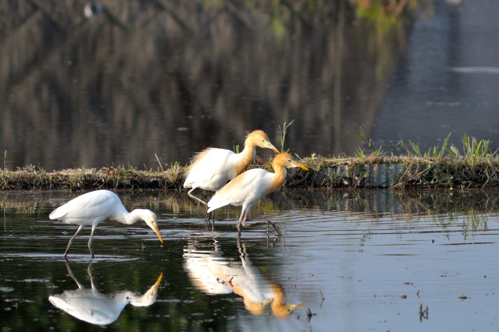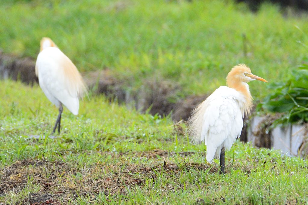 探すヒントをもう一点紹介します。実はアマサギは牛が大好きです。アマサギの英名は"Cattle egret"であり、この"Cattle"は牛を指します。東南アジアで農耕に使われる水牛などの周りをうろちょろしておこぼれをもらうことからつけられた名前だそうです。