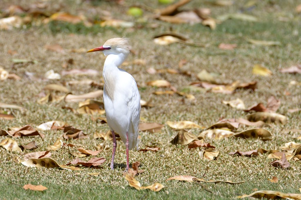 アマサギは学名Bubulcus ibis1種のみでアマサギ属を作ります。しかし亜種が2種(3種?)認められており、これらは"Bubulcus ibis ibis"と"Bubulcus ibis coromandus"いう2亜種となります。"B i ibis"は英名で"Western cattle egret"、ヨーロッパ、アフリカから南北アメリカにいる亜種です。もう一つの"B i coromandus"は"Eastern cattle egret"と言われ、アジアからオセアニアにいるものです。これを私の記録に当てはめると、今回のオアフのものはニシアマサギで、日本のものはヒガシアマサギ(日本では単に「アマサギ」ですが海外からみるとヒガシアマサギ」)となります。1枚目の赤色型を見る限り「ニシアマサギ」は日本のものに比べて赤色が薄目ですね。赤というよりほとんど薄いオレンジでしょうか。オアフのものは頭と胸だけが色づいています(背は飾り羽がほんのりレベル)が、日本亜種は頭と胸以外にあご、喉や背中もオレンジ色になりより派手に見えます。それでもこちらの1枚目の個体は目やクチバシのみならず足まで真っ赤になっていて、完全な婚姻色であることがわかりますから、これでも一番派手な衣装になったところなのでしょうね。