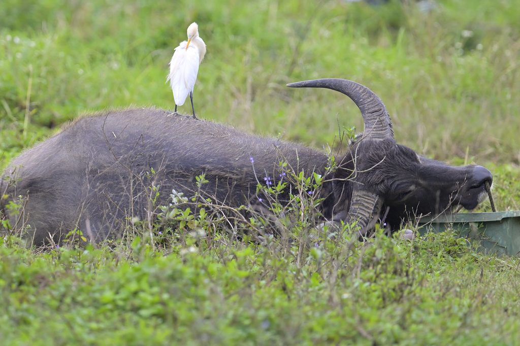 こちらは水牛と一緒のアマサギ。まるで「俺様が水牛を倒してやったぞ」みたいな感じですね。