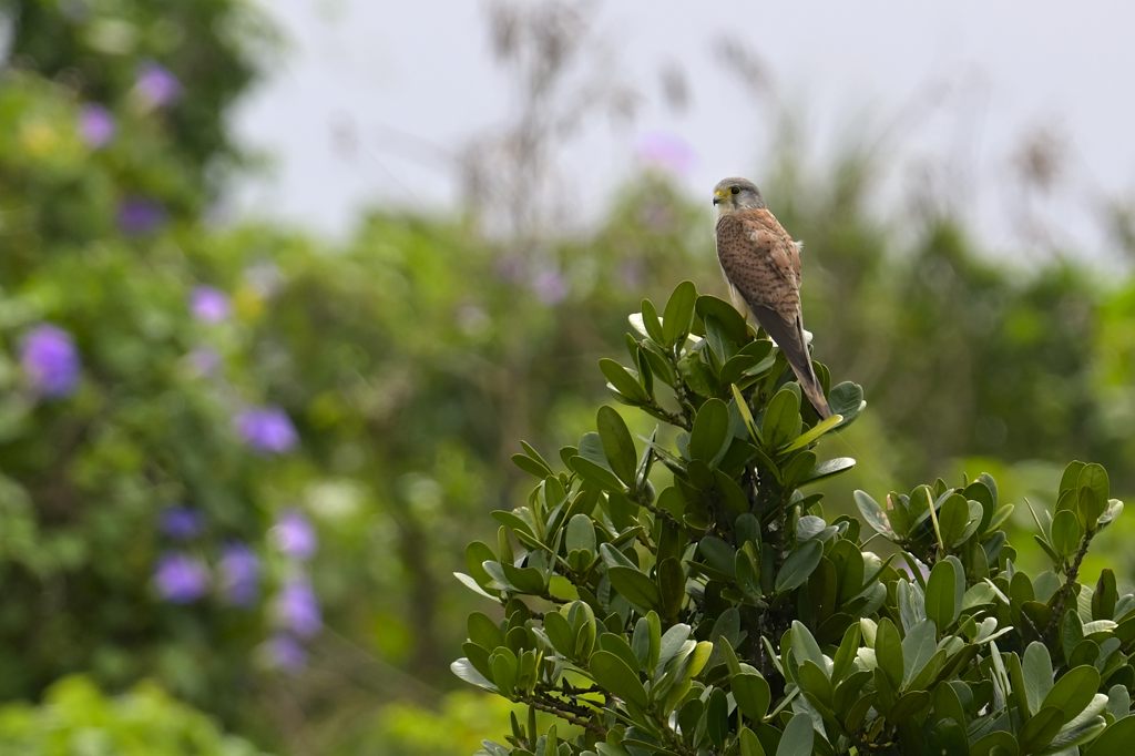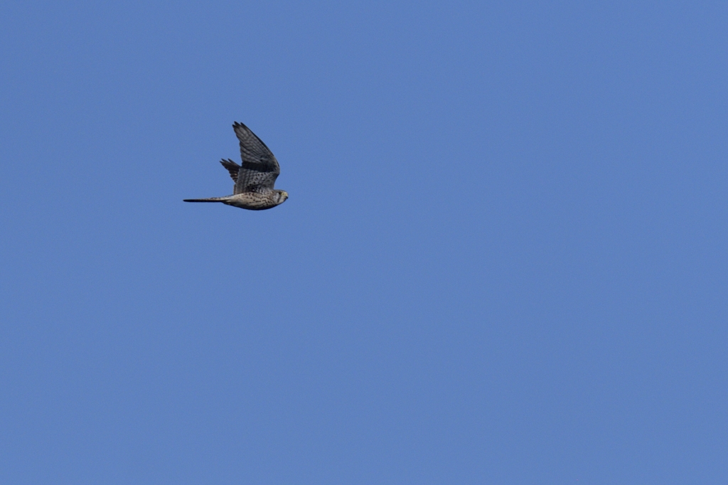 駐車場に車を止めて外に出てみたら、偶然頭上でチョウゲンボウがホバリングをしていました。チョウゲンボウのホバリングは色々なところでよく見ます。結構時間も長めに飛んでくれるのでカメラを用意する時間もあったりしますが、かといって落ち着いて準備するわけにもいきません。このときも焦りながらなんとか間に合わせて手持ちで撮ったのですが、気がはやるとやはりうまくはいかないものです。結果少しブレてしまい、小さめの絵での紹介となりました。