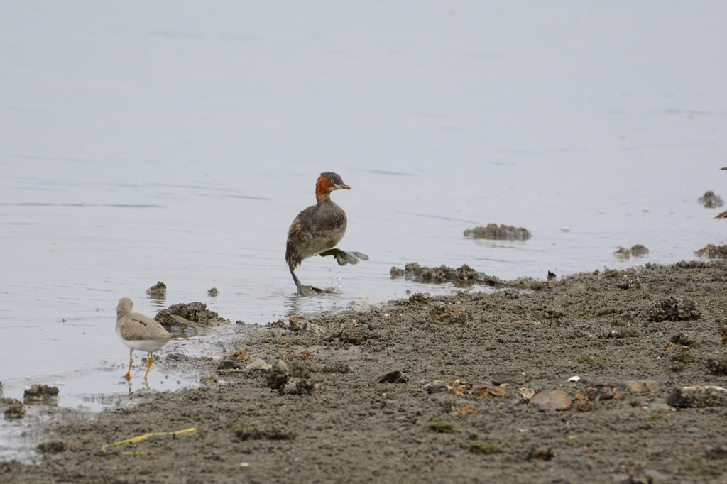 珍しく干潟の海にいたカイツブリです。カイツブリは体の割にすごく大きな足を持っているようにみえますが、足ひれが弁足といわれる指ごとに分かれたひれになっていて、これで水中の大きな推進力を生みます。また水中で前進しやすいように、足が身体の後ろ側から出ているため、立ち上がると身体が立つような姿勢になるのも独特です。