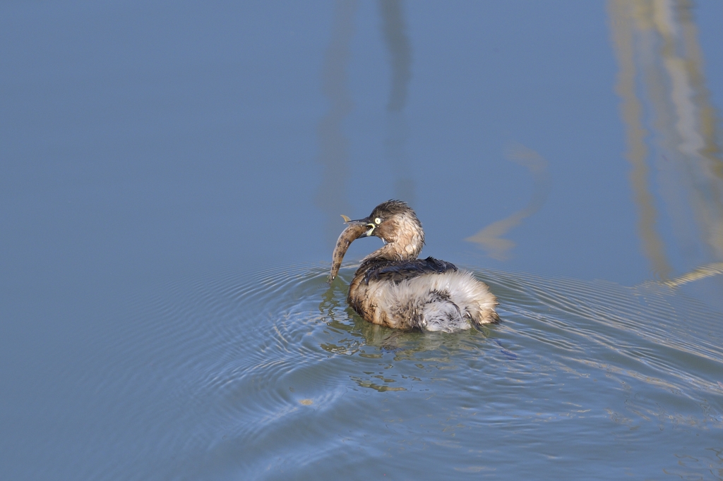 千葉の沼で見つけたカイツブリは、大きなハゼらしき魚を咥えていました。カイツブリたちは見ていてびっくりするような大きな獲物を一飲み込みで平らげます。よく喉が詰まらないものだと感心します。