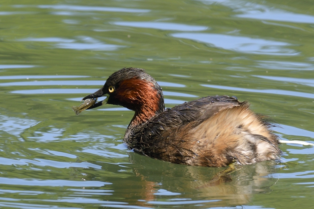 東京都内の公園にいたカイツブリです。1枚目、潜って捕まえたのはサイズ的にザリガニでしょうか。この時期のカイツブリは頬から首にかけてが濃い赤茶色となります。カイツブリは雌雄同色のため、性別は不明です。
